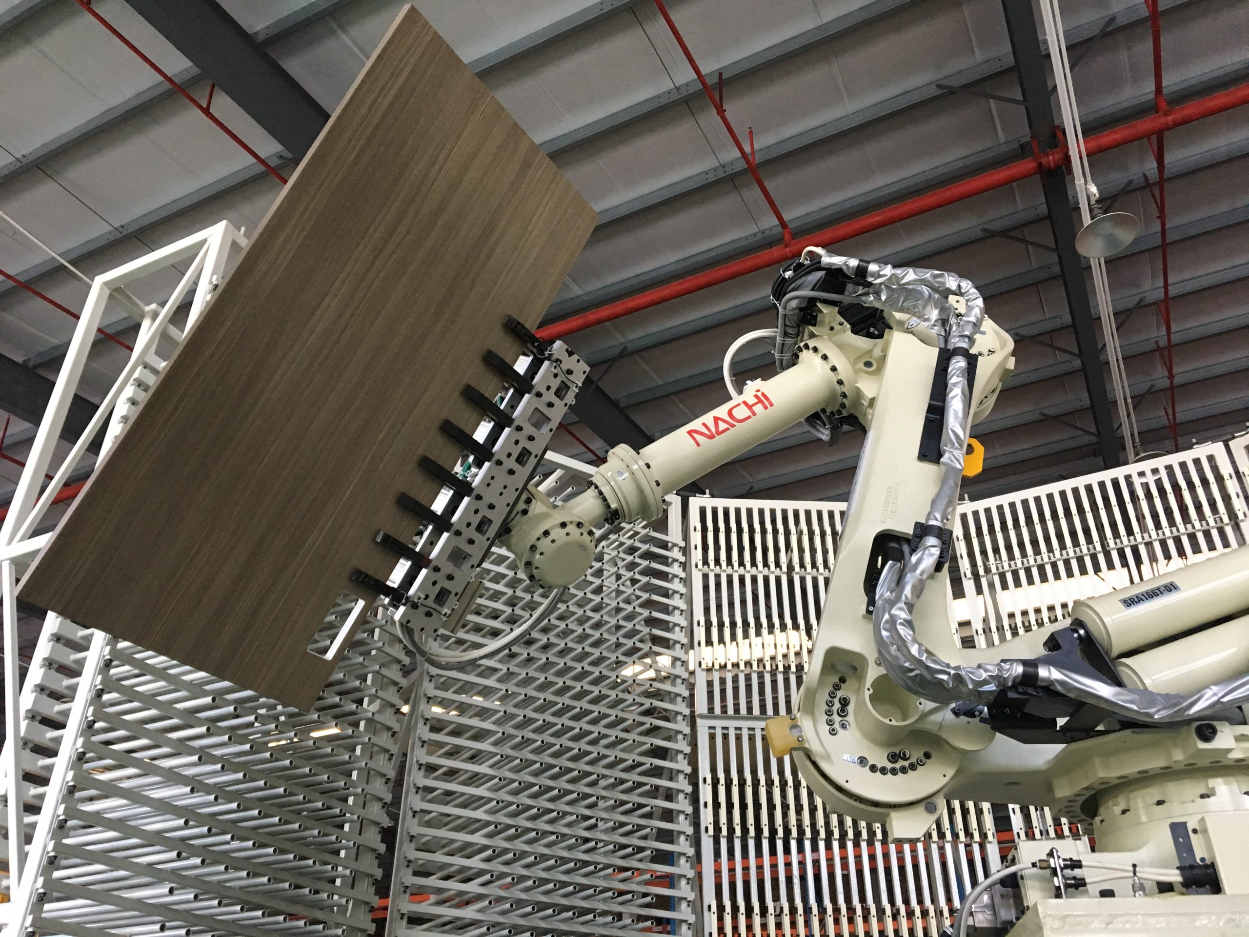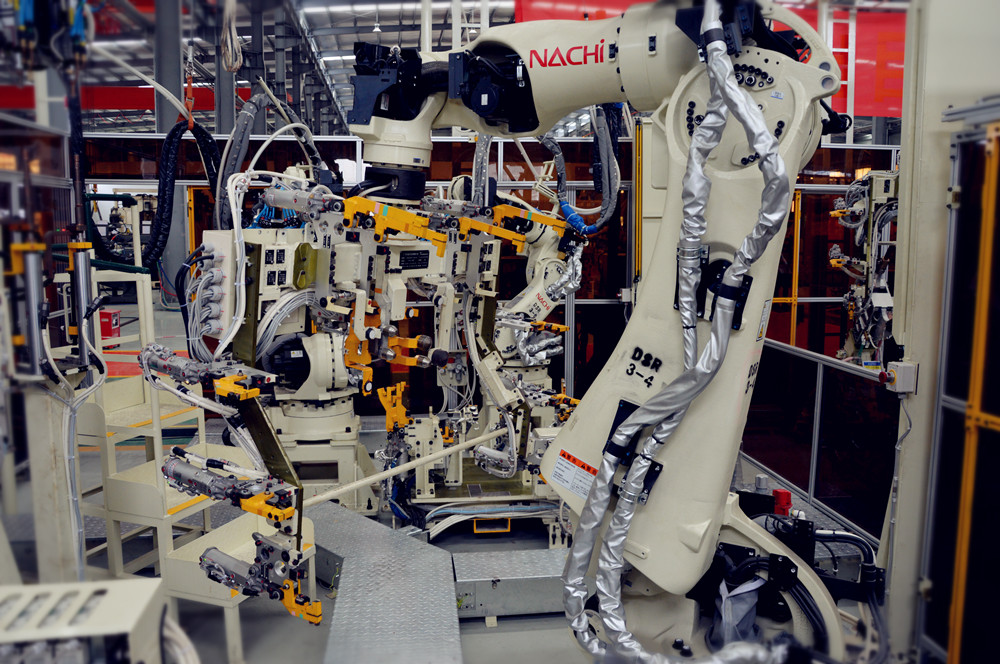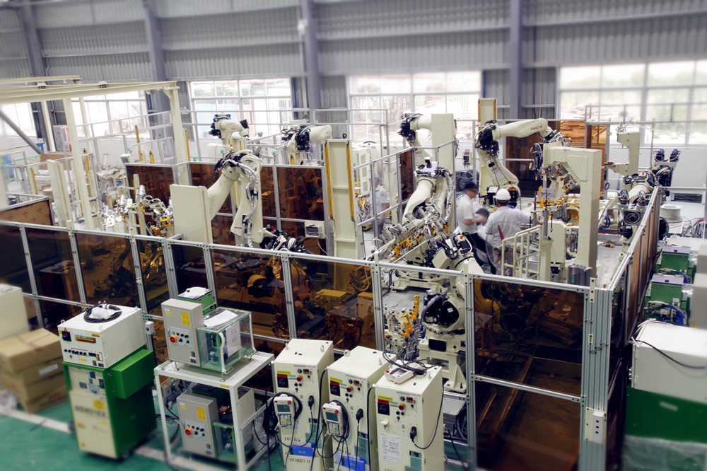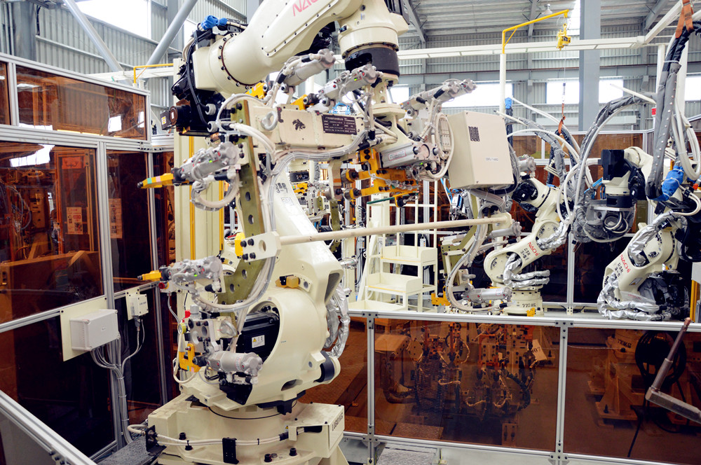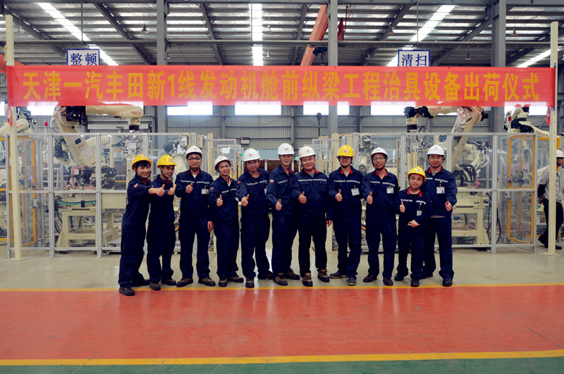 可實現3種車型的混線生產,采用豐田獨有電氣控制技術和自動聯動功能。占地緊湊集約,生產節拍48秒/件,年產20萬臺。